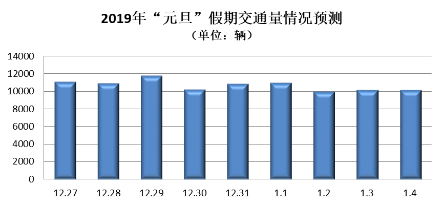 2019年“元旦”放假时间为12月30日-1月1日,共3天。根据全省现有交通量观测站的往年数据预测,2019年“元旦”假期全省普通国省干线日均交通量10680辆,较上年同比增长2.6%,处于自然增长水平;较日常水平增长5.3%,增幅较小,预计假期交通量整体处于基本畅通等级。交通量变化趋势预测情况见下图: