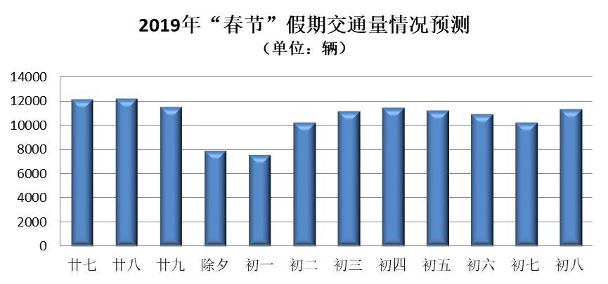 根据趋势图判断,交通量高峰日为节前三日,最高日交通量12196辆,较假期平均交通量高21.1%;交通量波谷日为除夕和初一,最低日交通量7548辆,较假期平均交通量低25.0%,假期交通量波动明显,预计将呈现出程相对集中,回程相对分散的特征。