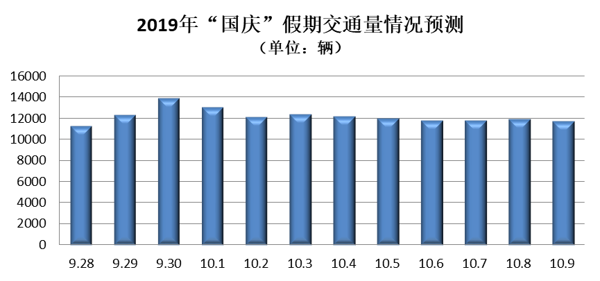 2019年“国庆”放假时间为10月1日-7日,共7天。根据全省现有交通量观测站的往年数据预测,2019年“国庆”假期全省普通国省干线日均交通量12190辆,较上年同比增长2.3%,处于自然增长水平;较日常水平增长4.1%,增幅较小,群众“国庆”假期偏向选择高速公路出行,预计假期交通量整体处于基本畅通等级。交通量变化趋势预测情况见下图: