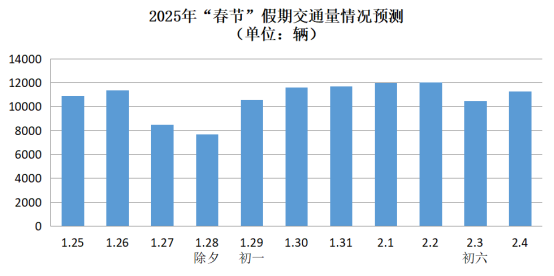 2025年“春节”放假时间为2025年1月28日-2025年2月4日,共8天。根据全省现有交通量观测站的往年数据预测,2025年“春节”假期全省普通国省干线日均交通量10914辆,较上年同比上升4.5%。交通量变化趋势预测情况见下图: