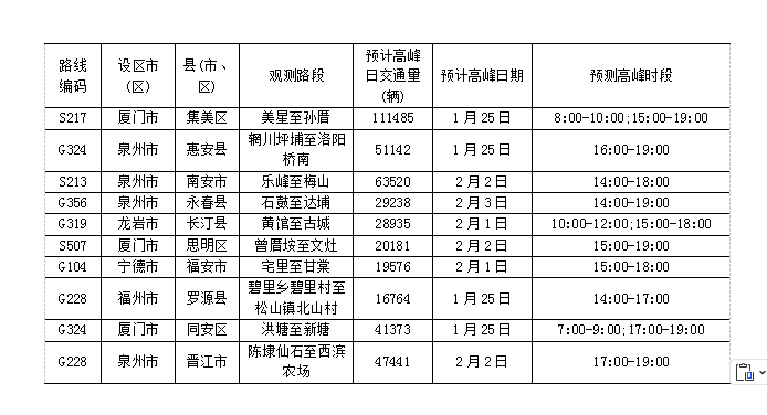 “春节”假期全省普通国省干线易拥堵路段主要集中在厦门、泉州、龙岩等地区。具体路段的预测交通量及高峰时段详见下表:
