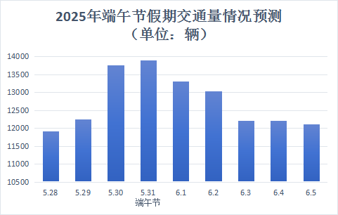 从变化趋势看,假期第一日(5月31日)为交通量高峰日,预计假期期间将出现相对集中的出行小高峰,假期后交通量逐步恢复至正常水平。