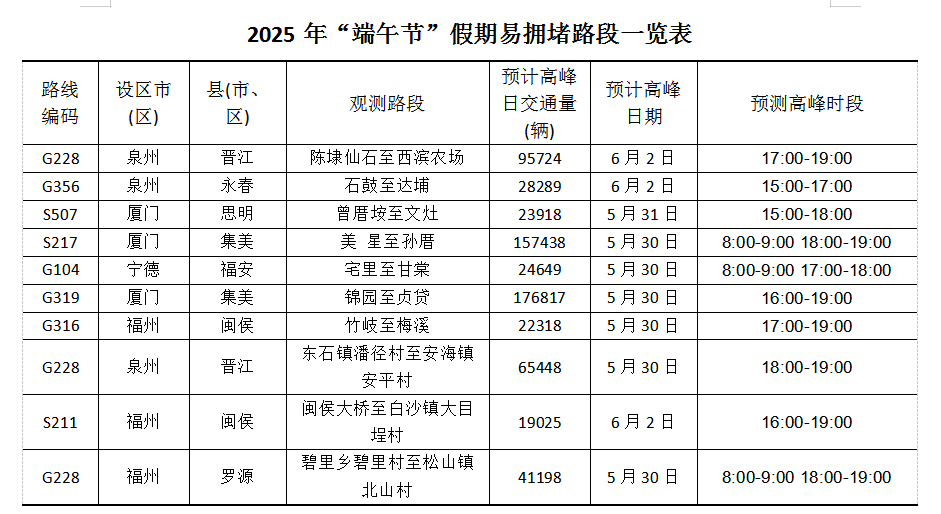 “端午节”假期全省普通国省干线易拥堵路段主要集中在福州、厦门、泉州等地区。具体路段的预测交通量及高峰时段详见下表: