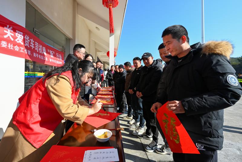 “师傅,给您送福啦!这是我们志愿者自己写的‘福’字和春联,祝您新年快乐,一路平安!”书法爱好者们提笔蘸墨,把对新年的美好愿景融入一张张“福”字和春联中,送给过往司乘人员,贴心的服务让司乘人员感受到了家的温暖。