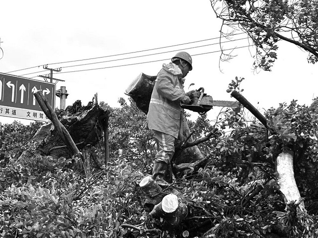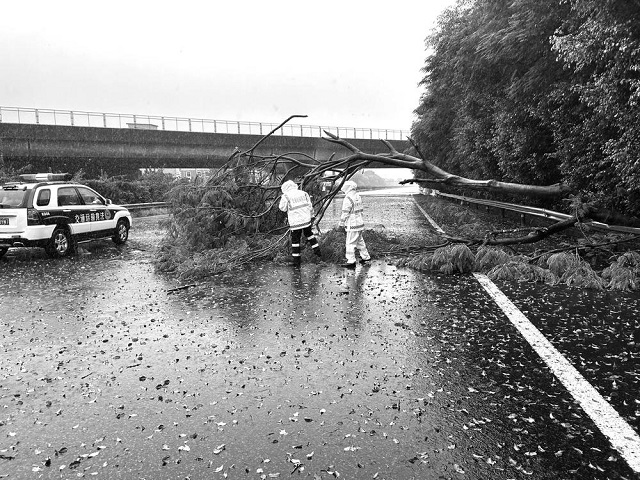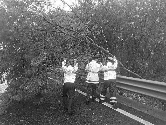 7月28日,厦门高速执法支队队员冒雨在沈海高速公路清理被吹断的凤凰树。(通讯员 郭水心)