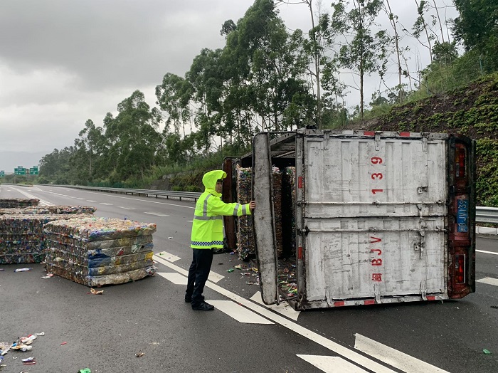 绝不能造成二次事故。7月28日上午,福州高速执法支队辖区G1505绕城线B128K+800m处,发生一起货车行驶侧翻事故,事故造成道路交通缓慢通行。接到警情后,祥谦中队党员林洪松立即带队到达现场处置,大雨如注,事故货车倾倒于超车道与主车道之间,厢式货车上运载的压缩塑料瓶其中有6捆掉落路面,每捆重达600公斤,远处看去就像巨大“石头”横亘在路面,由于该路段只有二车道,造成后续车辆缓慢通行,所幸无人员伤亡。