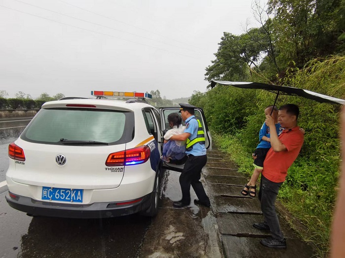 考虑到暴雨期间行车视线较差,长时间滞留高速公路将给现场人员带来极大安全隐患,执法员建议这位妈妈带两位小孩跟着执法人员先下高速。随后,执法员将三人安全地送到翔安收费站,并指导其通过手机下单联系了正规网约车,先行前往离收费站约7公里的方特梦幻王国,以免耽误游玩行程。