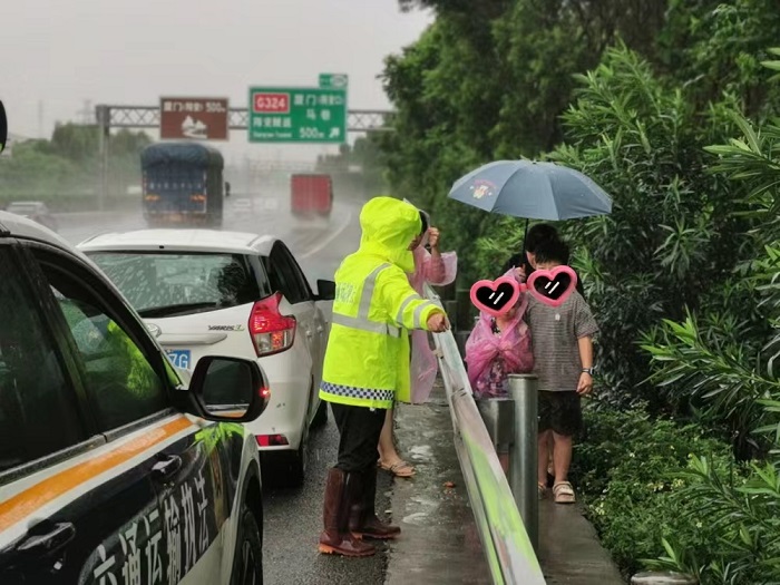 上午9时许,执法员巡查至沈海高速泉州往厦门方向离翔安收费站约500米路段,发现一辆故障车停在应急车道内,车外站着几位人员。经询问,执法员得知是一位妈妈带着两位小孩及一位朋友,从莆田出发,计划前往厦门方特梦幻王国游玩,没想到途中车辆爆胎了、车上备胎的胎压也不足,车上只有一把雨伞和两件简易雨衣,几人都被淋得浑身湿透。执法员随即进行现场布控,并联系抢修队伍加快前来维修。