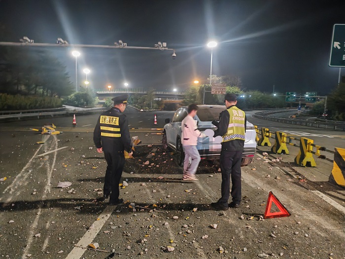 到场后,发现一辆闽D牌照小车连续冲撞10个中央隔离墩后,逆向停在入口外广场内,现场散落的混凝土碎渣近40平方米,所幸没有人员受伤。执法人员随即加强夜间安全布控,在完成现场路损勘验后,联合高速交警、养护人员分工协作,将尖锐的碎渣往内侧清扫,减少对入口广场通行影响,随后由清障车将事故车拖离现场。
