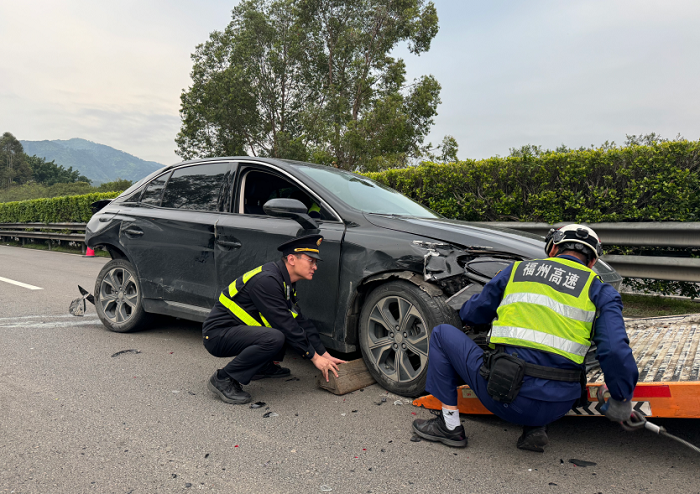 4月6日00:23,厦门高速执法支队执法人员接信息指挥中心紧急来电称,在厦门收费站发生一起小车冲撞隔离墩事故。执法人员立即赶赴处置,联系收费站工作人员进行临时布控,提醒过往车辆避让通行。
