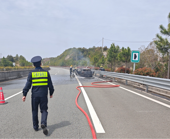 现场处置有序推进,消防队员率先对起火车辆展开扑救,高速交警同步实施交通管制,引导后方车辆在200米外安全区域停靠。待火势控制后,两名执法人员立即展开善后工作对惊魂未定的驾驶员进行情绪安抚,详细了解车辆自燃过程并登记事故信息,对事故波及的护栏、绿化带等路产设施进行专业勘验,使用执法记录仪全程记录受损情况。经多部门协作,现场于11时40分完成清理并恢复通行,事故未造成人员伤亡。