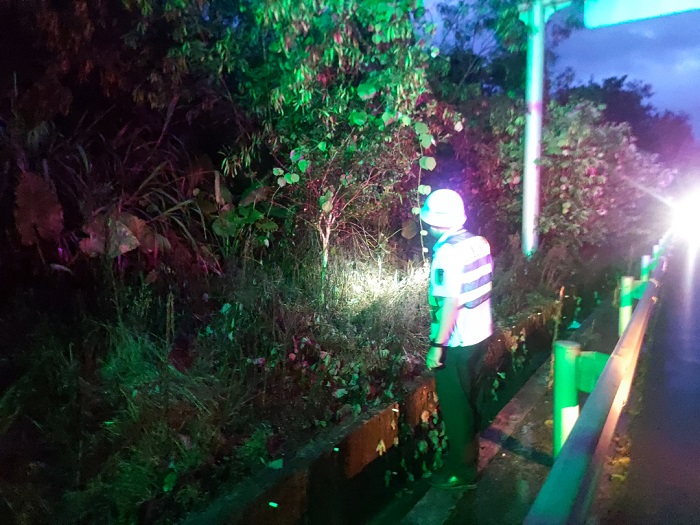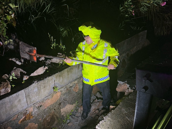 7月9日晚,福州雨势进一步加大,福州高速执法支队联合养护、路勤部门组建排查队伍,连夜开展道路隐患排查,重点针对辖区积水路段、排水沟、桥梁直排泄水口及过水涵洞等关键部位。排查中发现:莆炎高速B98K及B97K+800M处,沿线部分树木被强风吹倒至高速公路上;B105K+250M处因事故导致路肩硬化损坏,碎块堵塞排水沟,路面边缘出现积水;潼关互通桥面直排泄水口堆积了较多树枝、垃圾,影响排水速度。面对险情,执法人员立即设置安全警示标志,经过近3小时的紧急处置,安全隐患及时消除。