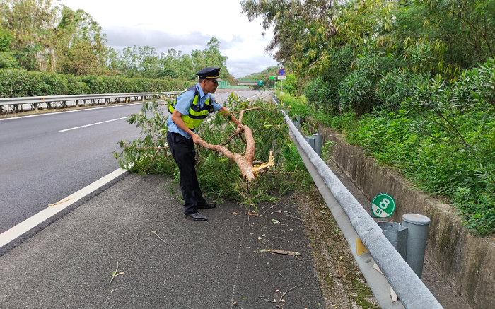 莆田高速执法支队对路面、隧道口、高边坡、施工路段等重点区域开展全面巡查。在秀永高速BK23+200、沈海高速BK2175+900等路段发现树木因狂风倒伏在路面,执法人员立刻在现场设置警示标志,引导过往车辆安全避让,随后联合其他“5+N”单位,将所有倒伏树木清理完毕。