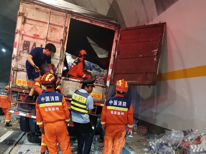 福州高速执法支队随即启动应急预案,立即沟通相关“5+N”联动协作单位并于12:16分到达现场。隧道内事故车辆紧贴墙壁,变形严重,司机受困;执法人员立即协同高速交警、消防清理路面抛洒货物,并引导隧道内车流绕行避险,保持隧道畅通;针对仍然受困的司机,救援人员采用科学破拆的方式,于13时50分成功解救司机并转送去就近医院;确保人员安全后,各单位工作人员投入善后工作:对散落矿泉水进行盘货、转运;并将事故车辆拖至福州南停车场等待进一步处理;完成救援工作的执法人员不忘本职工作——在撤出隧道前完成了路产损失的勘验,并联系养护部门进行相关修缮工作。