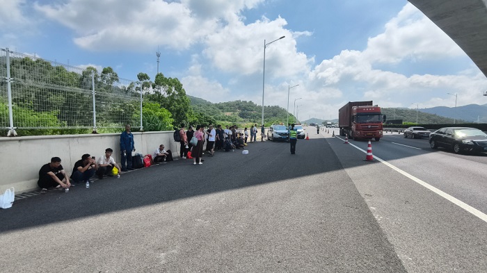 附近的同安中队与其他“5+N”单位迅速到达现场,面对复杂情况顿感人手不足,随即向支队请求支援;现场的执法人员协同高速交警立即展开安全布控,引导过往车辆绕行避让;为避免次生事故的发生,也为避免滞留乘客中暑,执法人员将所有乘客有序引导至桥面下阴凉处集中休息,避免他们闯入快车道和超车道,并向他们分发矿泉水;客运公司紧急调遣的车辆到达后,执法人员迅速对车辆、驾驶员等相关证件资质进行核验,随即组织乘客有序登上转运车辆。清障车将故障车拖至就近的翔安收费站后,执法人员又协助乘客完成大件行李物品转移。