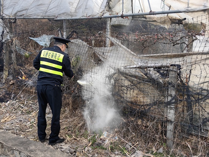 执法人员火速抵达现场,第一时间使用随车灭火器展开先期扑救,重点守护周边农户葡萄园种植区,果断阻断火势向民房和农田蔓延。同时,迅速向指挥中心上报现场情况。随后,消防救援力量抵达,对高边坡火情进行彻底扑灭。