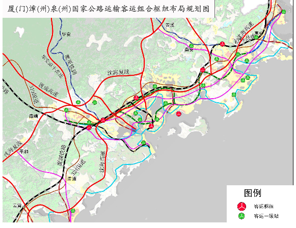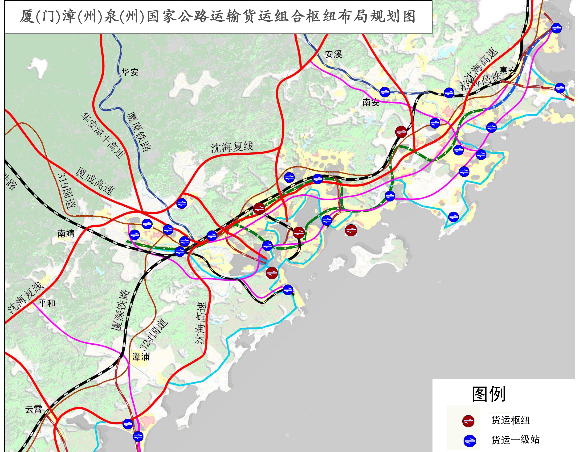 厦(门)、漳(州)、泉(州)国家公路运输枢纽由28个客运枢纽站场和30个货运枢纽站场组成,总占地面积647万平方米。其中客运枢纽站场总占地面积130万平方米,站场旅客发送能力为36万人次/日;货运枢纽站场总占地面积517万平方米,站场货物作业能力为5500万吨/年。客运枢纽站场和货运枢纽站场分别见下表,站场布局分别见以下两图。