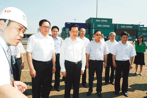 在开发区内的中石化海南炼油化工有限公司,胡锦涛详细了解这家公司800万吨炼油项目的生产经营情况,并前往公司30万吨级原油码头视察。
