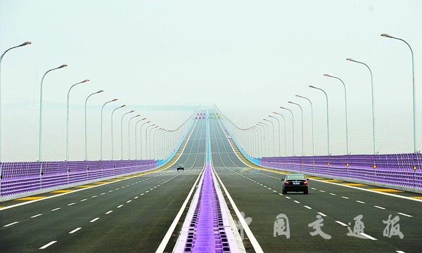 全长36公里的杭州湾跨海大桥即将于5月1日通车,届时将缩短宁波至上海间的陆路距离120公里。日前,大桥进行了一系列亮灯测试。