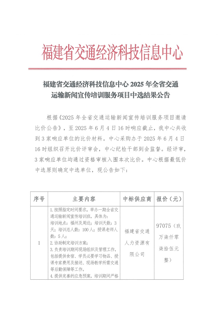 福建省交通经济科技信息中心2025年全省交通运输新闻宣传培训服务项目中选结果公告