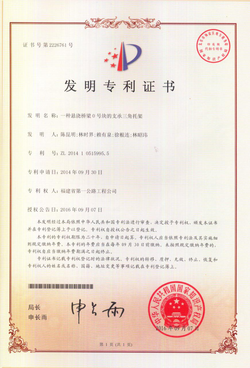 云平高速公路A6标项目(福建第一公路工程集团有限公司)控制性工程岩坑1号大桥主跨上部结构为2×75m连续悬浇梁,桥梁全长160m,主墩高51m;大桥桥墩位于深沟峡谷之中,水流湍急,作业空间狭小; 0号块支架若采用落地支架等现有技术方案,则成本高、搭设支架工期长、安全隐患多。为确保施工安全,加快施工进度,经多方案比较,0号块支撑托架最终采用公司自主研发的 “一种悬浇桥梁0号块的支承三角托架”(专利号:ZL201410515995.5)技术。