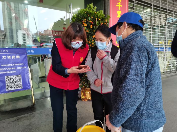 “您别着急,看看医保卡或者驾驶证之类的证件有没带。”得知情况后的王燕连声安慰满脸愁容的老杨。老杨翻了翻随身的行李也没找到其他证件。“别着急,您手机有带吗?手机里有安装闽政通和微信吗?”“有的,这个我有。”“那您可以扫描这个二维码,输入身份证号、手机号,进行人脸识别后就可以领取临时乘车证明,我来教您操作。”在志愿者王燕的帮助下,务工人员老杨很快申领到了临时乘车身份证明,连声道谢的老杨,笑着踏上了自己的春运返乡之旅。
