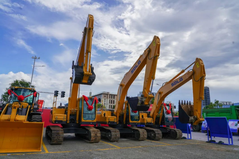 推土车、钩机同时作业发出阵阵机器轰鸣声,现场一派繁忙景象......