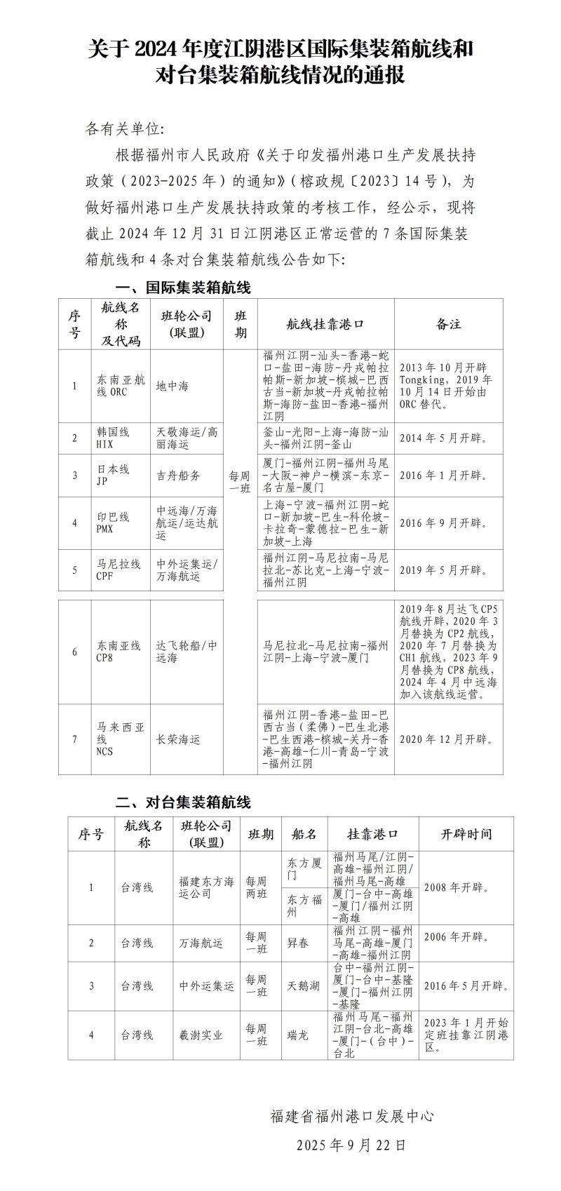 关于2024年度江阴港区国际集装箱航线和对台集装箱航线情况的通报