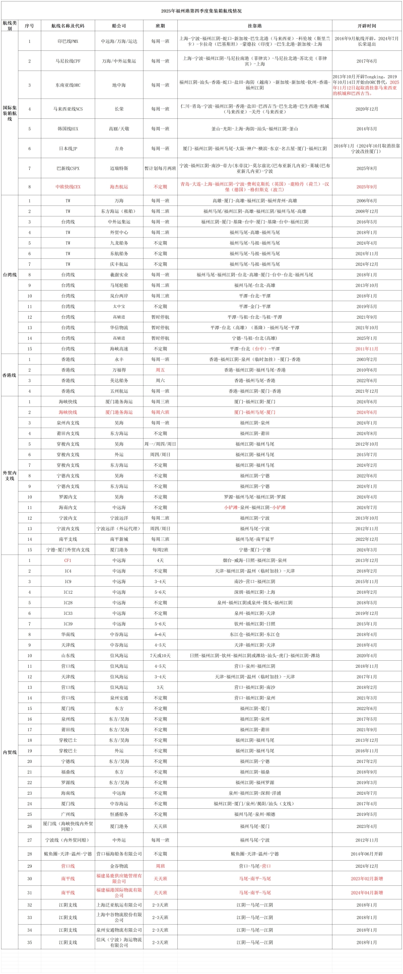 2025年福州港第四季度集装箱航线情况