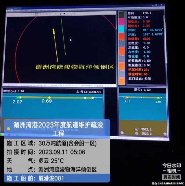 “现在是9月14日晚23:02,自航耙吸式挖泥船已到达湄洲湾疏浚物海洋倾倒区,准备开始抛泥作业,目前装载量:5428方,泥门状态:关闭,即将打开……”