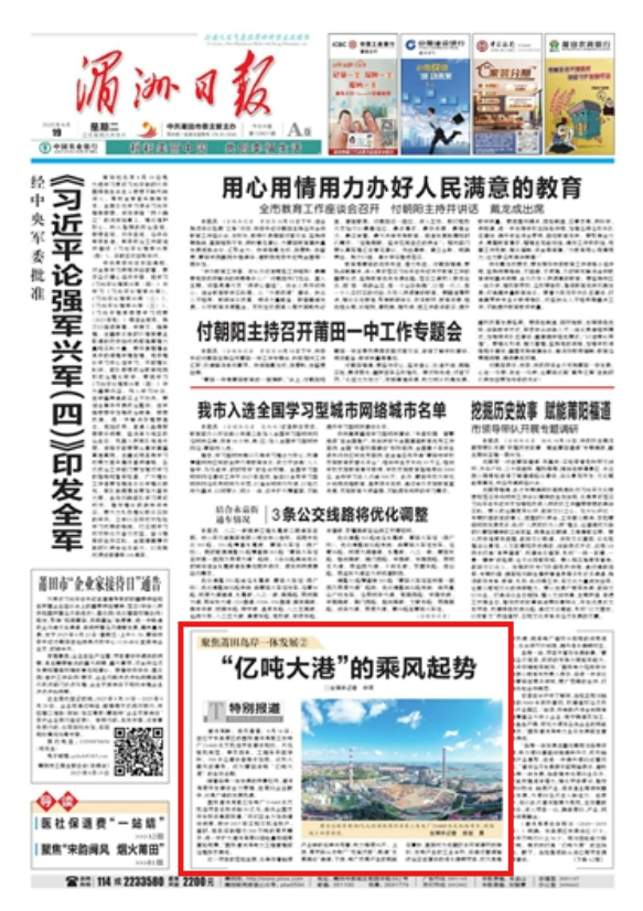 《湄洲湾港总体规划(2020—2035年)》明确,东吴港区布局泊位37个,其中万吨级以上36个,规划吞吐能力超亿吨,是我市打造“亿吨大港”的主阵地。眼下,当地推进码头泊位等项目提速建设。罗屿8号泊位冲刺建设第二个40万吨级码头,罗屿13号7万吨级散货泊位提前完成沉箱安装,罗屿港口14号、15号泊位工程完成首件沉箱安装,为加快项目后续建设打下坚实基础……一个个泊位串珠成链,为临港产业打开纵深。福建省罗屿港口开发有限公司相关负责人表示,将全力加快项目建设进度,为莆田建设“亿吨大港”赋能。