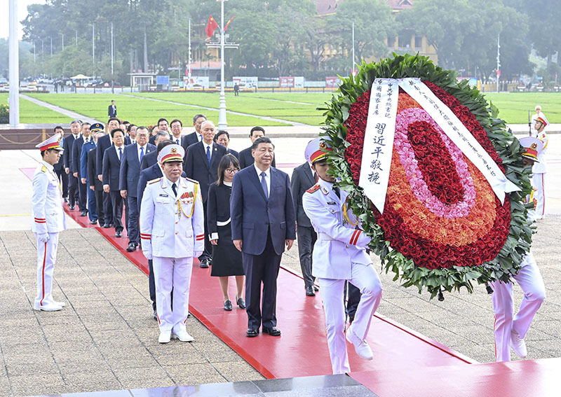 当地时间12月13日上午,中共中央总书记、国家主席习近平在河内瞻仰胡志明陵并敬献花圈。新华社记者 申宏 摄