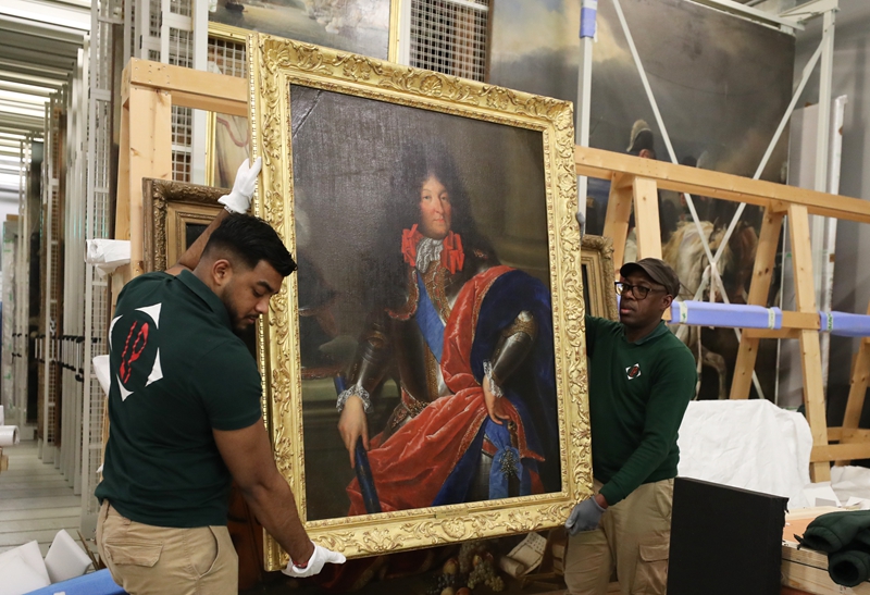 2024年3月11日,在法国巴黎近郊的凡尔赛宫,工作人员准备打包油画《路易十四戎装像》。在2024年中法建交60周年暨中法文化旅游年之际,凡尔赛宫和故宫博物院于4月至6月在故宫共同举办“紫禁城与凡尔赛宫——17、18世纪的中法交往”展览。新华社记者 高静 摄