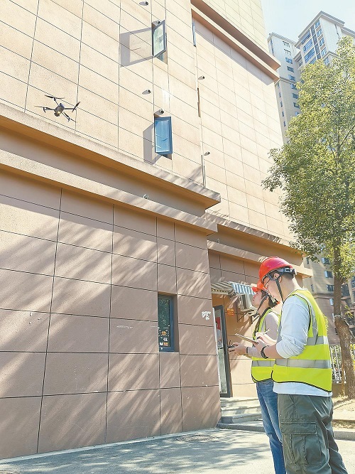 省建科院房屋体检团队使用无人机和爬墙机器人对建筑外墙装饰面开裂空鼓情况作检测。(温昭云 摄)