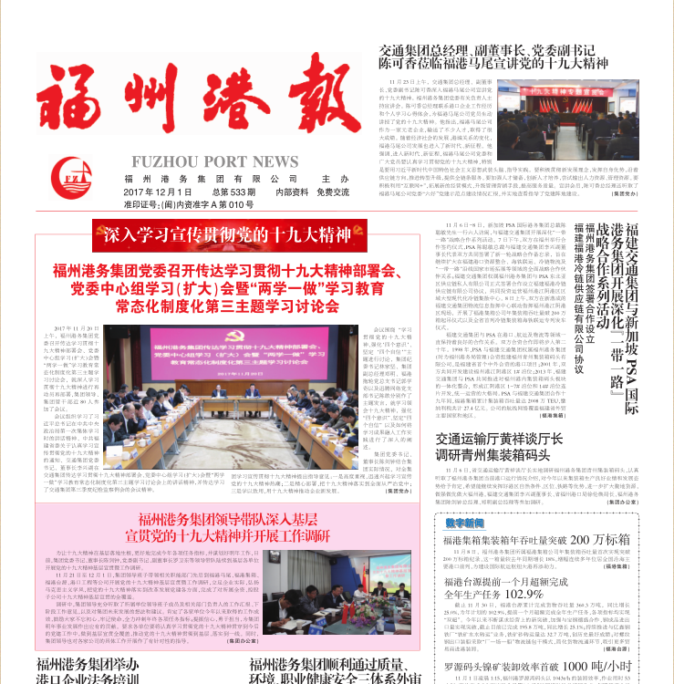 《福州港报》改版闪亮登场!为贯彻落实党的十九大精神,打造文化自信品牌,树立良好企业形象,福州港务集团党委近期对《福州港报》进行全面升级改版。12月1日,第533期的《福州港报》带着淡雅的油墨香全新面世,这是《福州港报》自1986年创刊以来走过的第32个年头,承载着福州港厚重的历史积淀和深沉文化底蕴。新版的《福州港报》采用大版面(2开4版)设计,全彩色印刷,力求以更多元的新闻视角,更深入的专题报道,更清新的文学创作,全面提升港务集团宣传阵地建设,在企业改革发展的关键时期发挥思想引领、舆论推动、精神激励和文化支撑的积极作用。
