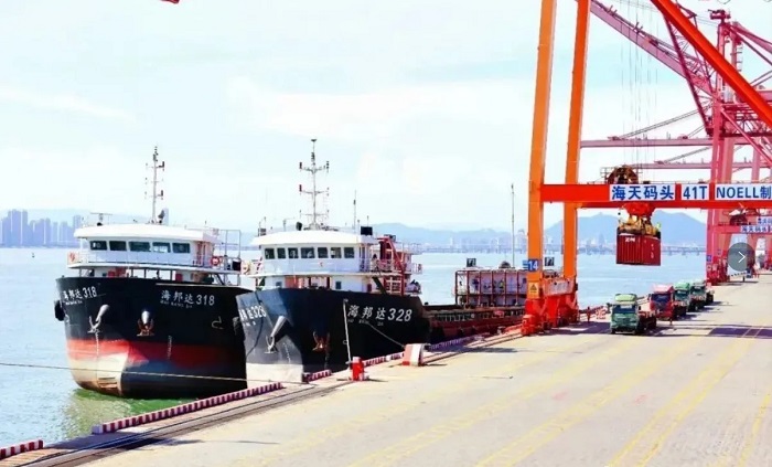 近日,在厦门港东渡港区海天码头12#泊位,驳运船舶“海邦达318”轮平稳靠泊于支驳船舶“海邦达328”轮外档。随着第一个集装箱从“海邦达318”轮上跨船卸载到码头拖车上,标志着厦门港首次“双档靠泊”作业正式开启。