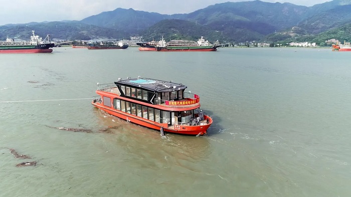 8月8日,我省建造的首艘现代双层纯电动游船“茉莉号”在福建福宁重工建造基地顺利下水。