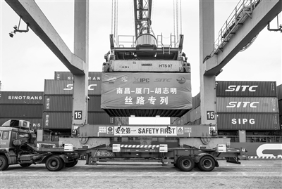 “南昌—厦门、厦门—赣州‘丝路海运’集装箱海铁联运班列的双向对开,将东南亚和江西等内陆腹地进出口货物通过厦门港海铁联运有机衔接,形成有形的丝路海运通道。”厦门港务控股集团有限公司副总经理、福建丝路海运运营有限公司总经理蔡立群表示。
