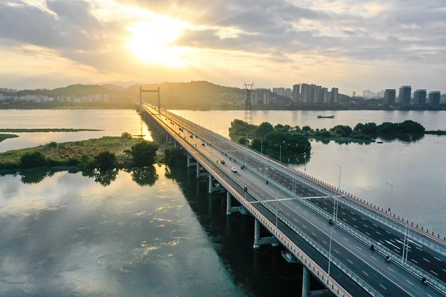 其中,新洪塘大桥长2.2公里,桥宽46至63.5米不等,为独塔式双索面自锚式悬索桥。