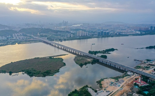 洪塘大桥施工采用“2-1+1=1方案”,先在老桥两侧建设2座新桥;两侧新桥部分通车后,拆除1座老桥,后施工中间部分桥梁,形成1座全新洪塘大桥。此种拆建结合的方式,国内尚属首次。