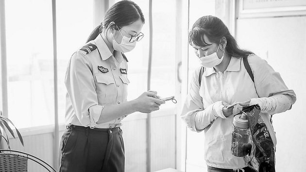 安检区,工作人员在引导旅客出示健康码。(丛文俊 摄)