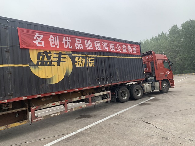 7月22日傍晚,名创优品广州有限责任公司有一批赈灾物资要从武汉运输前往河南洛阳红十字会。盛丰物流集团负责人接到消息后,立即决定帮忙运输这批赈灾物资,不收任何运费。为保障赈灾物资最快抵达,盛丰物流集团及时安排抽调武汉当地子公司运输技术好、路况熟悉的驾驶员负责运输,并组织人员连夜装货。23日凌晨1点27吨矿泉水、方便面等救灾物资装车完毕,即刻出发前往洛阳。