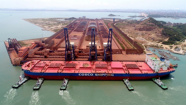 湄洲湾港可满足世界最大40万吨矿石船靠泊接卸。图为40万吨矿石船“远福海”轮首靠湄洲湾港罗屿9号泊位并顺利接卸。(省交通运输厅 供图)