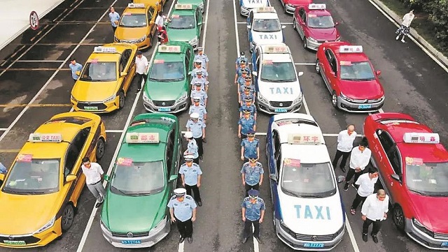 参加爱心送考活动的出租车及交管人员集结。(省教育厅供图)