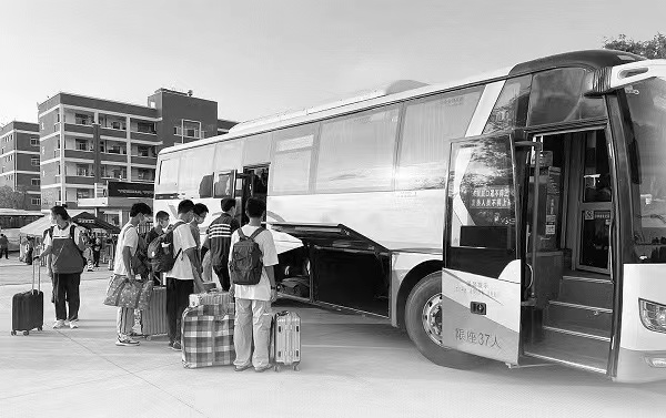 福建省莆田一中新疆籍高中生乘坐专车前往高铁站。(徐婷婷 供图)