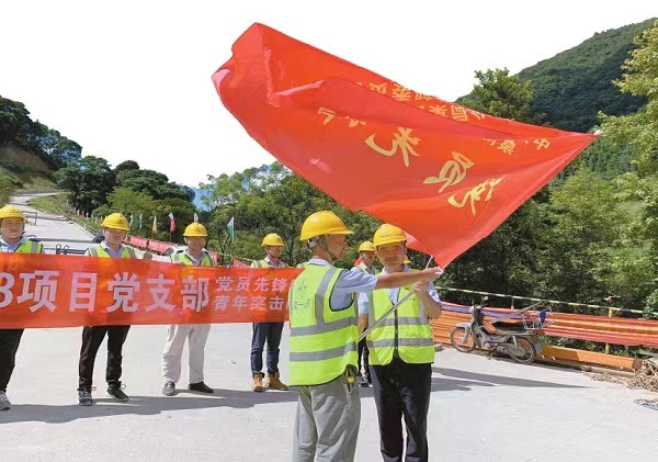 以党建引领,以奋斗开路。日前,A3合同段壶东溪大桥施工现场党旗飘扬,党支部副书记任亮为悬浇梁党员先锋队、青年突击队举行了授旗仪式。连日来,在广大党员、青年团员的带头冲锋下,项目建设者以更加强烈的责任担当,迅速掀起大干热潮,仅用12天就完成了施工防护棚的搭建,为后续大桥的施工奠定了坚实的基础。