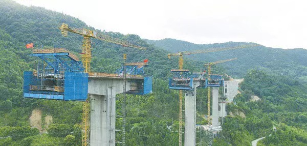 在壶东溪大桥施工现场,工人们正在进行桥梁上部结构悬浇施工。据了解,该桥最高墩柱高度达88米,确保高空作业时的施工安全是关键。