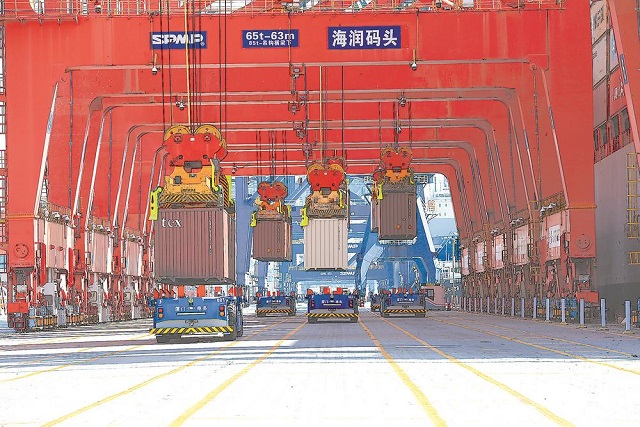 此后,海润码头的8台桥吊、22台龙门吊全部进行智能化改造,应用桥吊远程操控、智能理货、集卡智能导引等技术,实现船舶装卸智能化;应用RTG(轮胎式龙门吊)自动操控等技术,实现堆场装卸自动化。