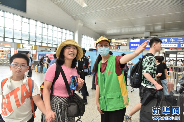 车站志愿者引导旅客出行乘车。新华网发(江曲 摄)