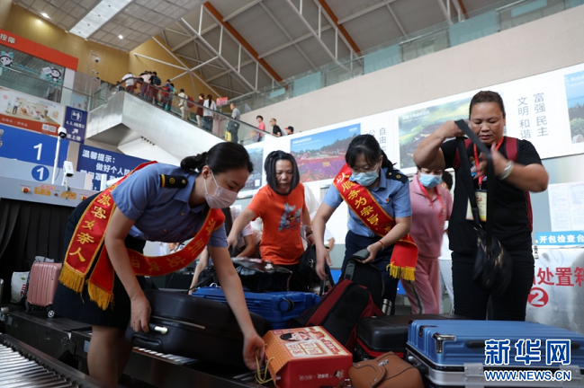 漳州站客运值班员服务旅客过安检闸机。新华网发(陈明 摄)